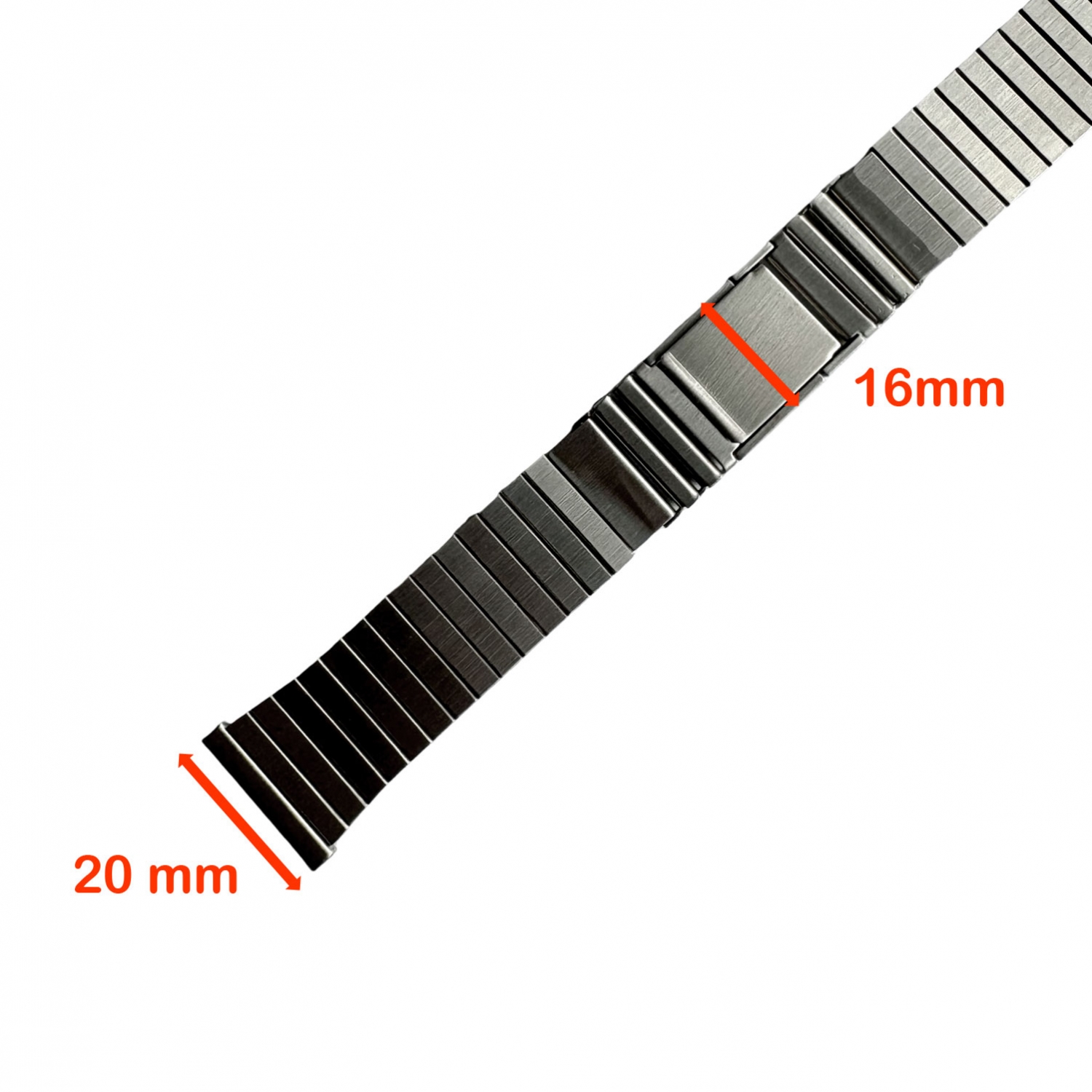 The watch bracelet is 20mm wide at the lug and 16mm at the clasp. As customary in the 70's, the lug end can be made smaller with a file, so it also fits to watches with 18 and 19mm lugs. We advise you not to buy the bracelet if your wrist size is larger than 18cm.